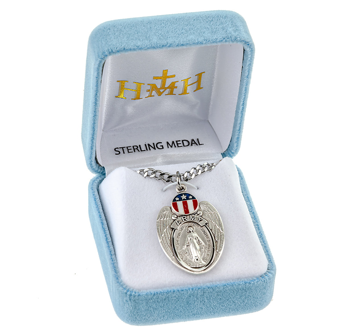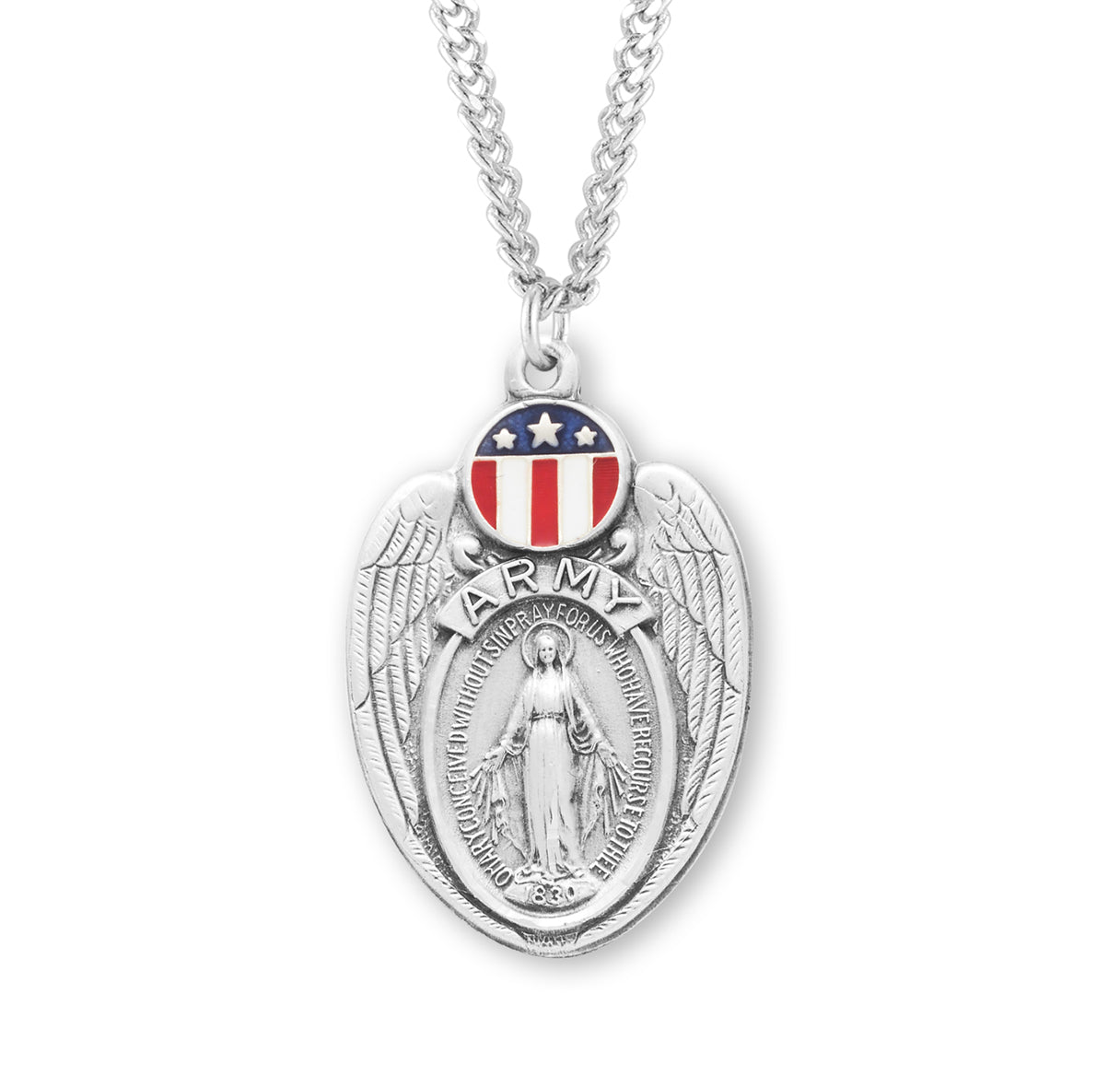 - Army red, white, and blue, enameled Miraculous medal-pendant.