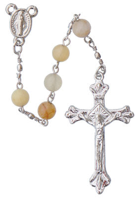 This quality 6mm gemstone rosary is crafted with extra sturdy links and is really beautiful. This rosary has a Miraculous Medal centerpiece. The crucifix, centerpiece and links are rhodium plated so they will not tarnish. The rosary comes in a deluxe gift box.