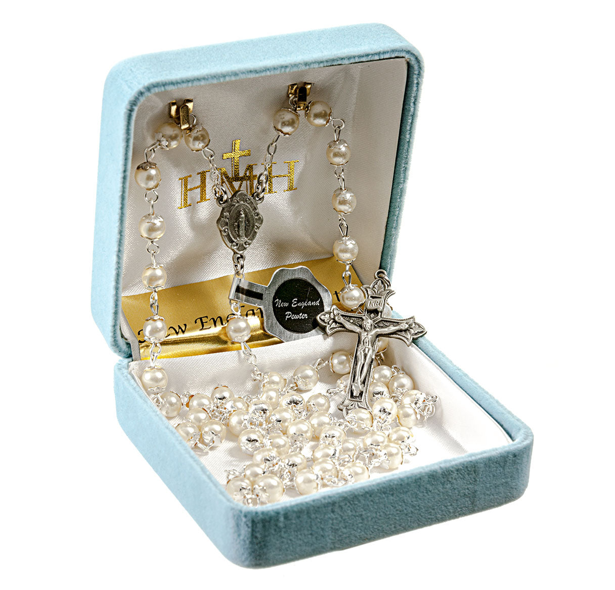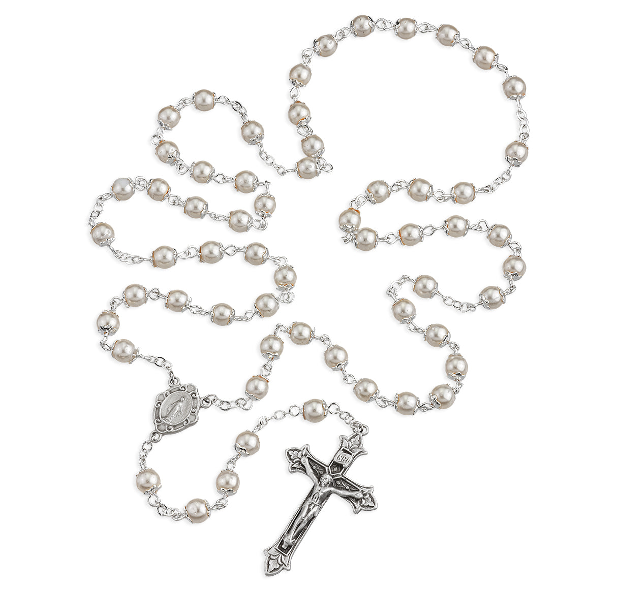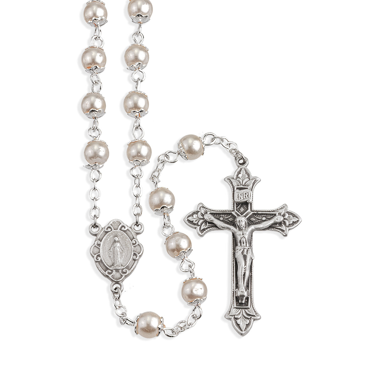 Imitation Pearl Double Capped New England Pewter Rosary