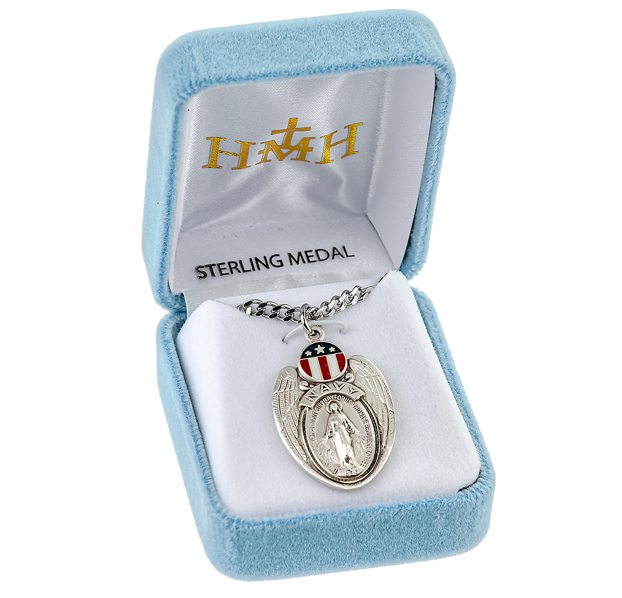 - Navy red, white, and blue, enameled Miraculous medal-pendant.