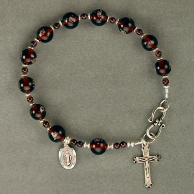 This is a hand crafted flex-wire rosary bracelet made from 8mm Czech glass lampworked beads with sterling and garnet spacers. The crucifix, medal and Bali clasp are sterling silver. The small flower is actually made of glass and is embedded in the bead as part of the lampwork process. This heirloom quality rosary bracelet is strung on 26 pound test jewelers wire to make it extremely durable. Many more colors are available, including black, pink, baby blue, blue, mint green, red, wine red, and gray.You may customize your color, length, size of bead, clasp and medals! Contact us to special order if the combination you' like is not shown. Please allow extra time for delivery of this rosary bracelet since it is made to order.