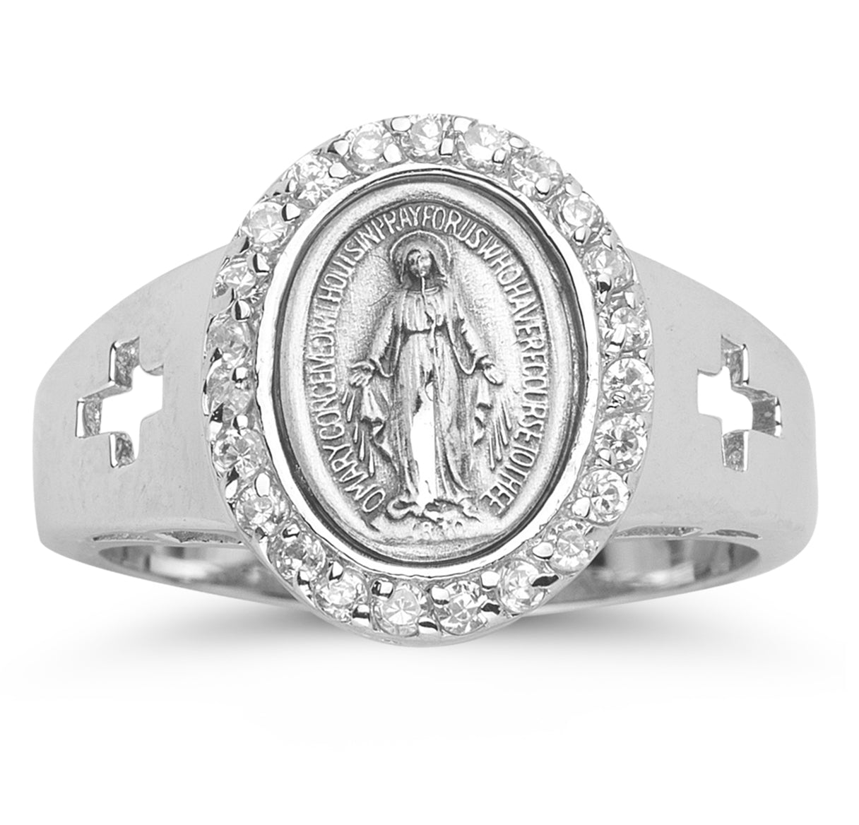 Sterling Silver Miraculous Medal Crystal Cubic Zirconia Ring Size 6