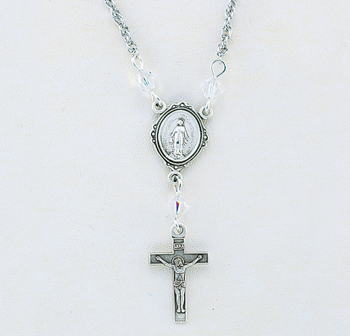 Sterling Silver Miraculous Medal Necklace Adorned with 4mm Aurora Borealis finest Austrian Crystal Beads