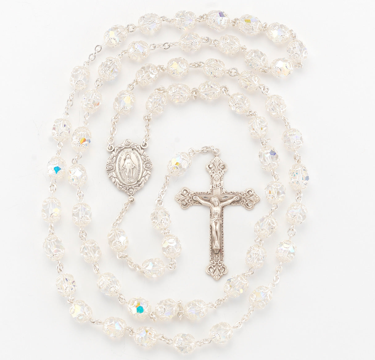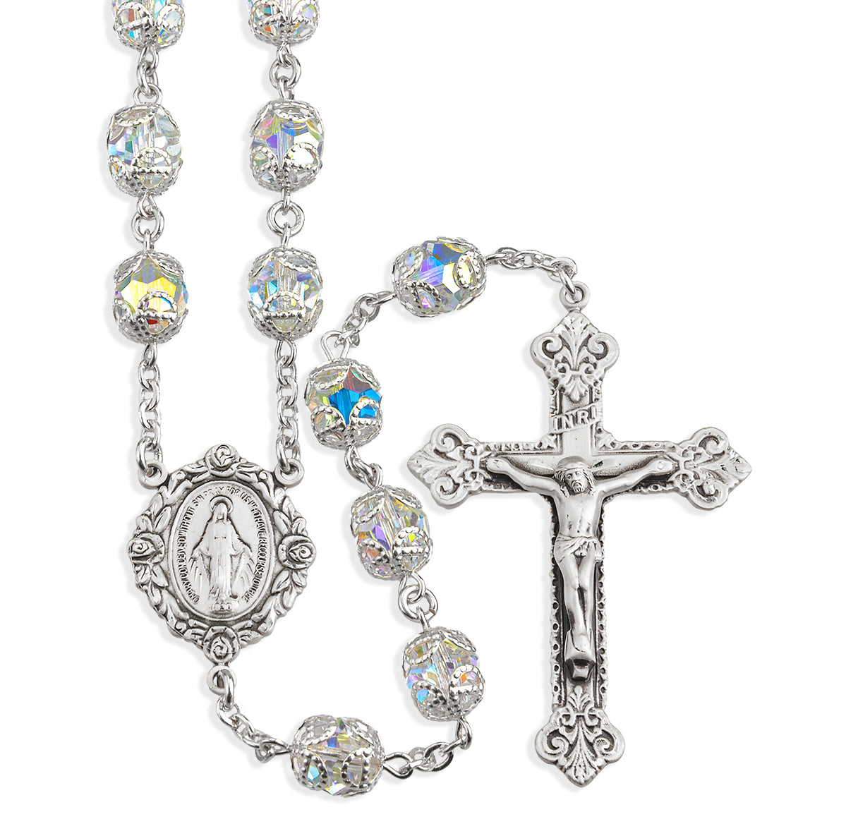 Sterling Silver Rosary Hand Made with finest Austrian Crystal 8mm Aurora Borealis Double Capped Beads by HMH