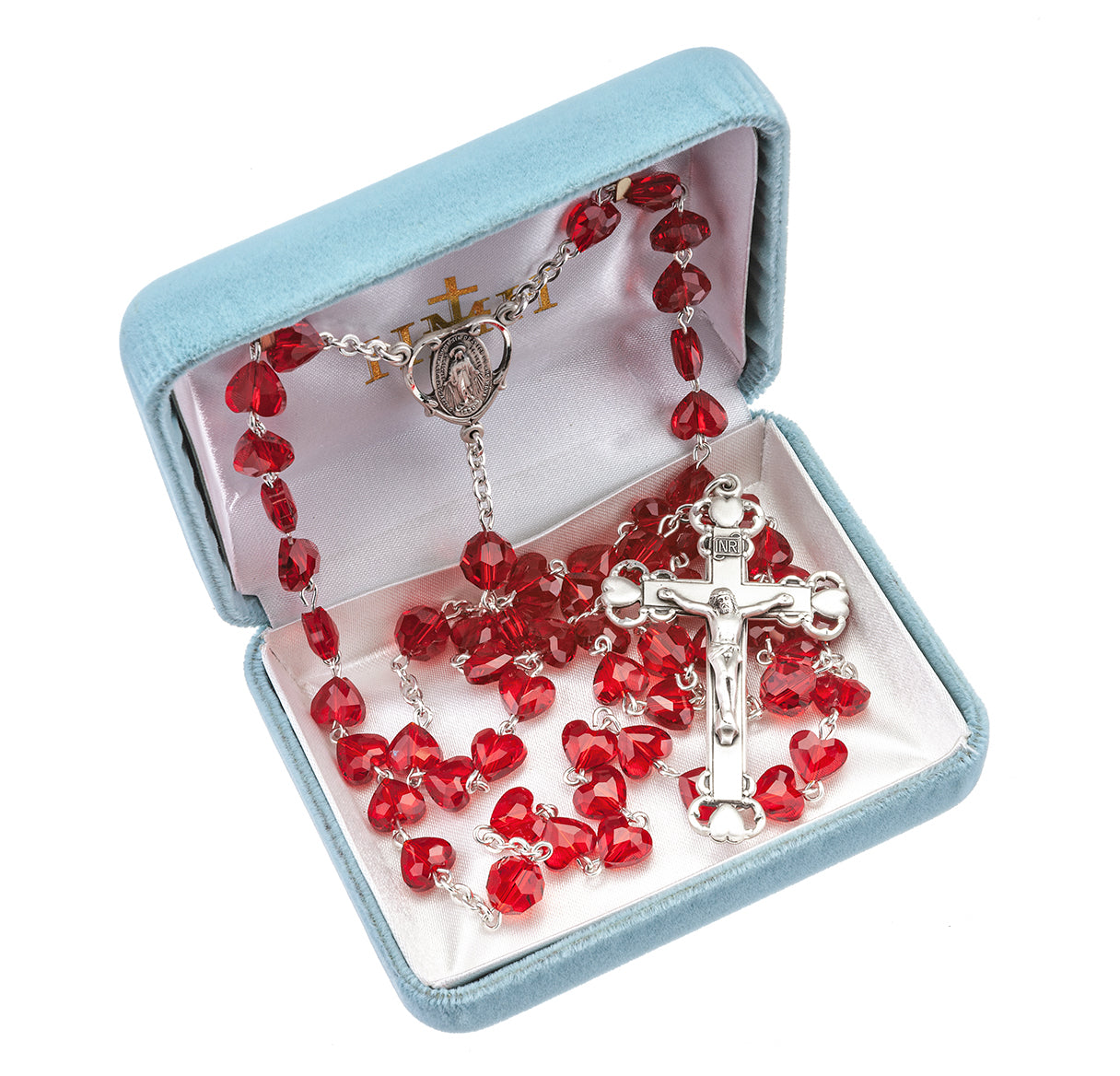 Sterling Silver Rosary Hand Made with finest Austrian Crystal 8mm Red Heart Shape Beads