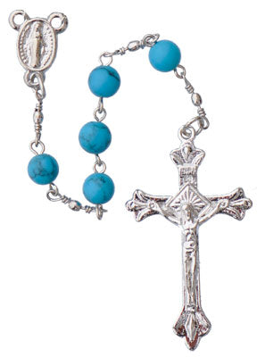 This quality 6mm gemstone rosary is crafted with extra sturdy links and is really beautiful. This rosary has a Miraculous Medal centerpiece. The crucifix, centerpiece and links are rhodium plated so they will not tarnish. The rosary comes in a deluxe gift box.